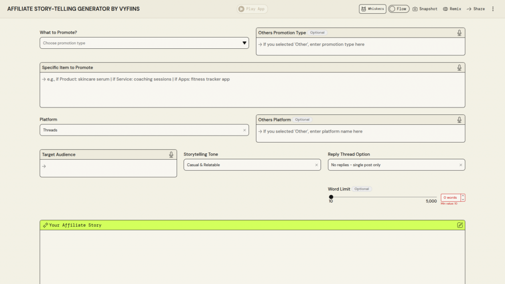 Application Description: This application helps affiliates and business owners create compelling promotional content quickly and effortlessly by generating powerful storytelling for anything—from products and services to events—in just seconds. It allows users to easily adjust the tone to suit any audience and publish content across multiple platforms, eliminating the need to overthink what to write and enabling them to focus on creating high-impact content that drives conversions.