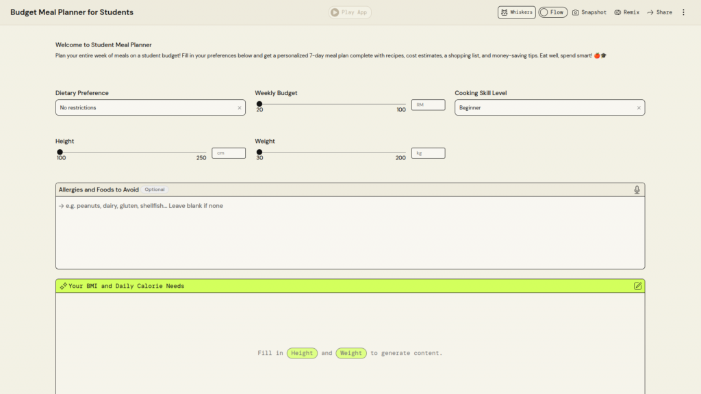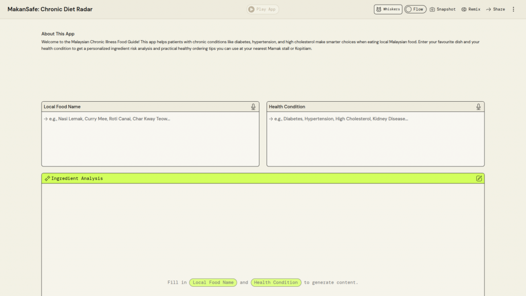 University Name: Universiti Malaysia Terengganu (UMT) Student Name: Nur Hidayah Aqilah Binti Zanal @ Zainal Category: Digital Health Application Description: Recipe suggestion that can be made based on user available ingredients. PartyRock Application Link: https://partyrock.aws/u/qilliet/yxQ2Al2Tf/Kitchen-Magic%253A-Cook-What-You-Have