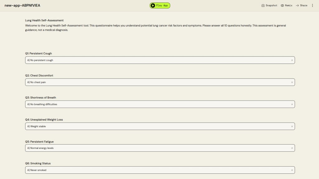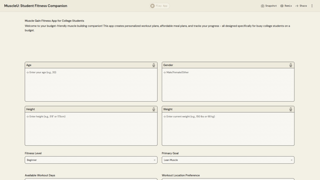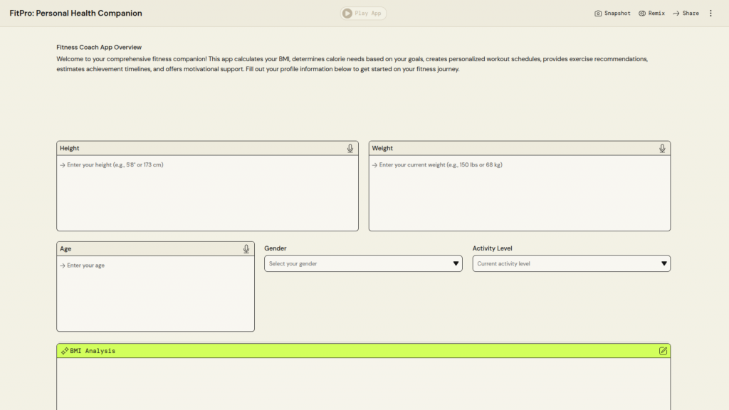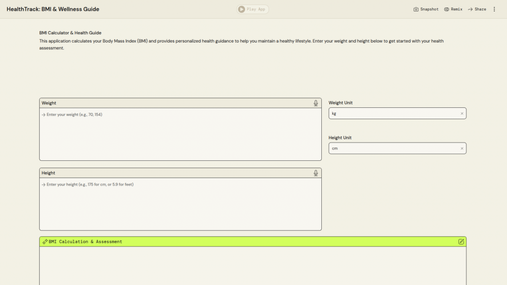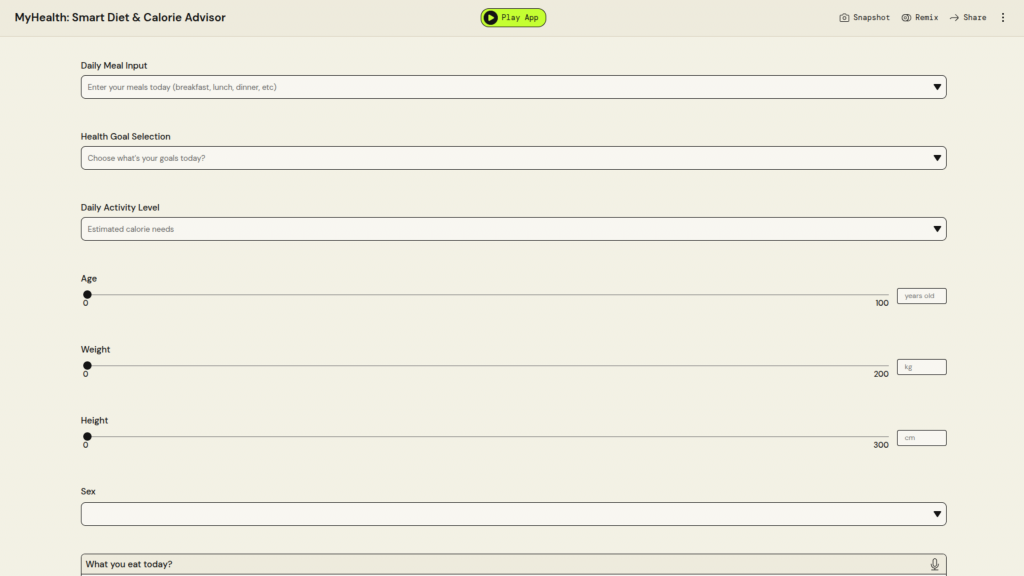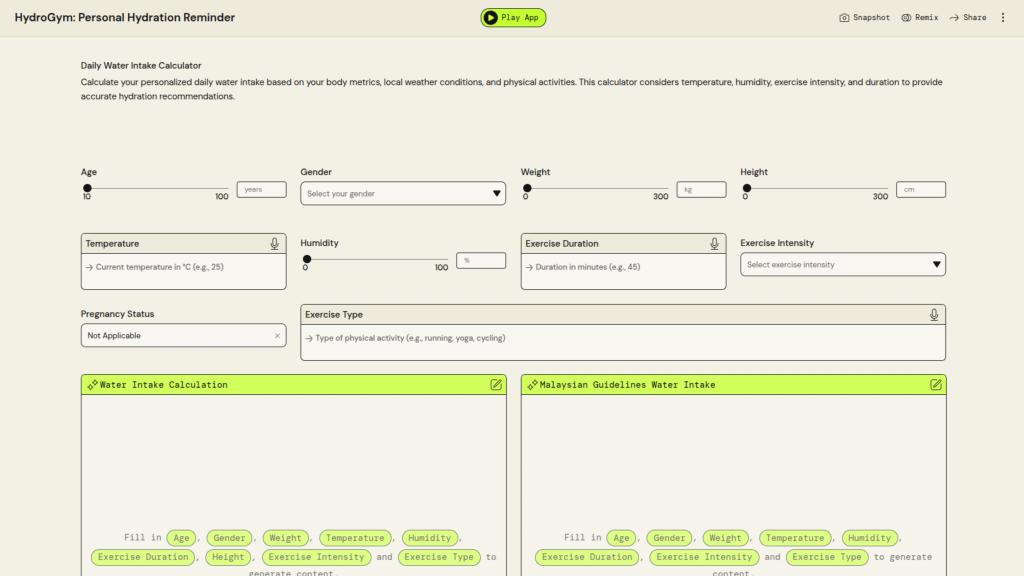 University Name: Universiti Teknologi MARA (UiTM) Student Name: Muhammad Afiq Haikal Bin Mohd Syaiful Azmi Category: Digital Health Application Description: HealthTrack: a comprehensive BMI calculator and wellness guide that provides personalized health assessments and actionable lifestyle recommendations to help users maintain a healthy lifestyle PartyRock Application Link: https://partyrock.aws/u/Ekalllllll/3W_hpg4_K/HealthTrack%253A-BMI-and-Wellness-Guide