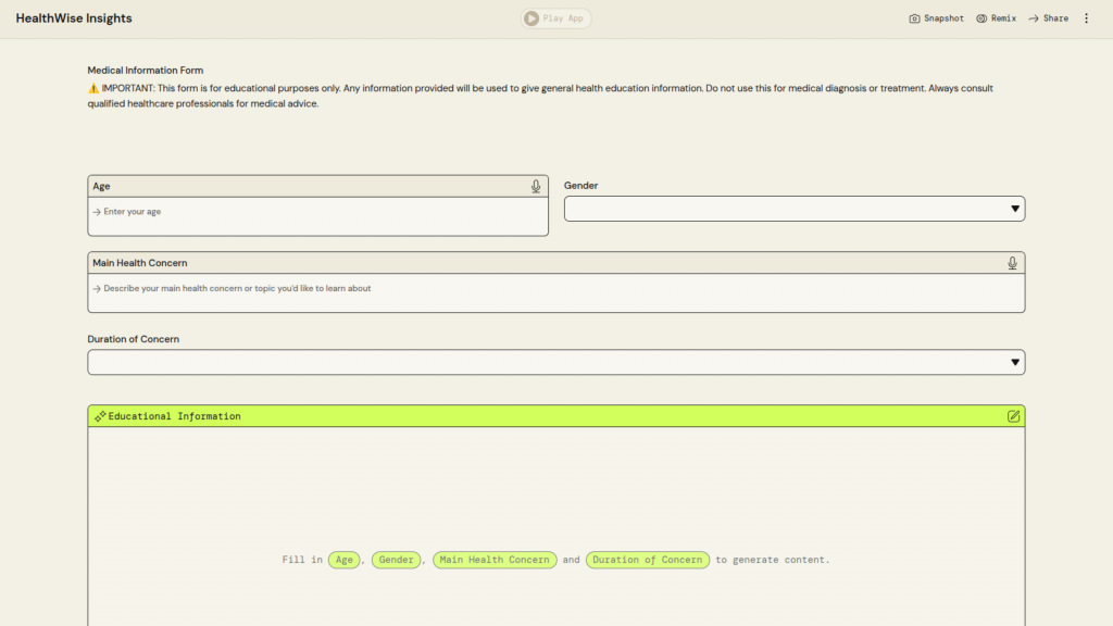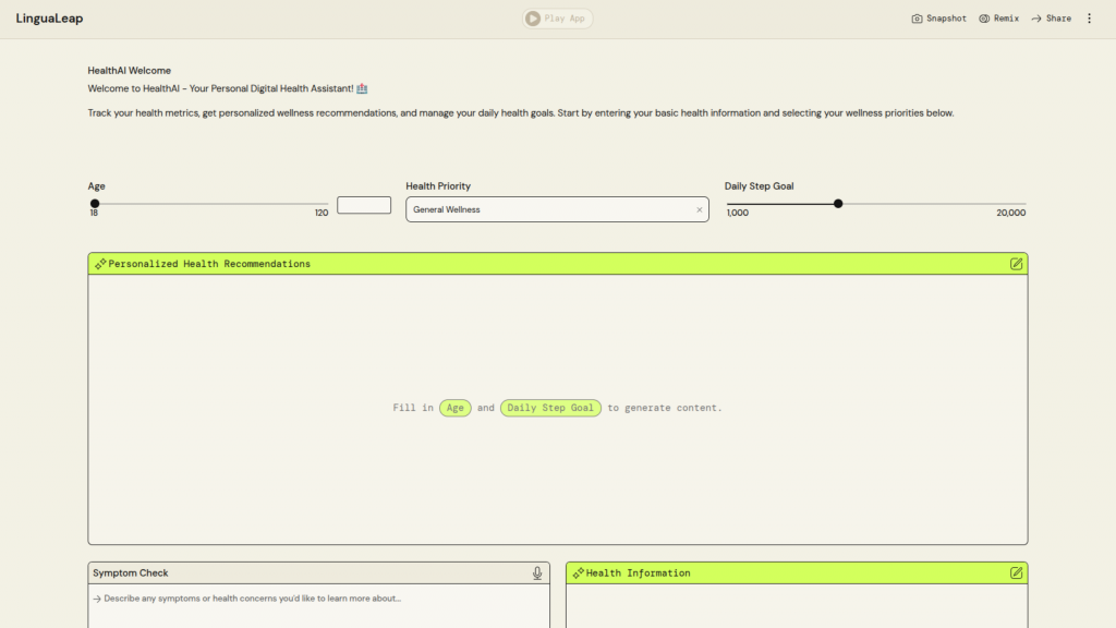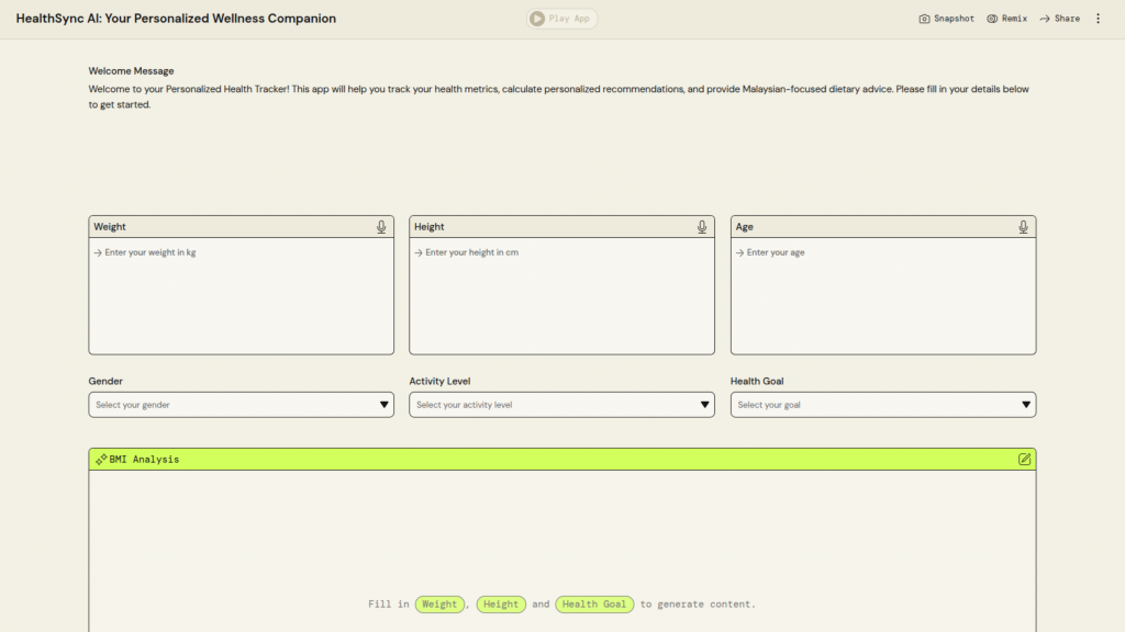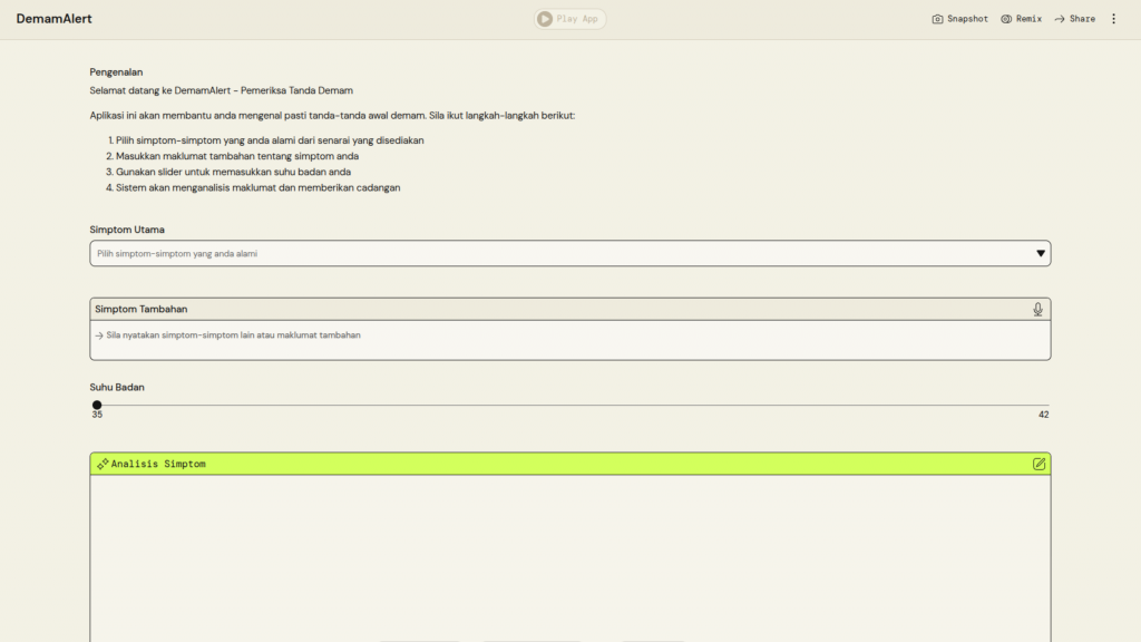 University Name: Universiti Malaysia Perlis (UniMAP) Student Name: Nurul Aleeya Binti Jasni Category: Digital Health Application Description: Build an application to check whether someone got fever or not PartyRock Application Link: https://partyrock.aws/u/nurulaleeya/xZQuVMNAx/DemamAlert