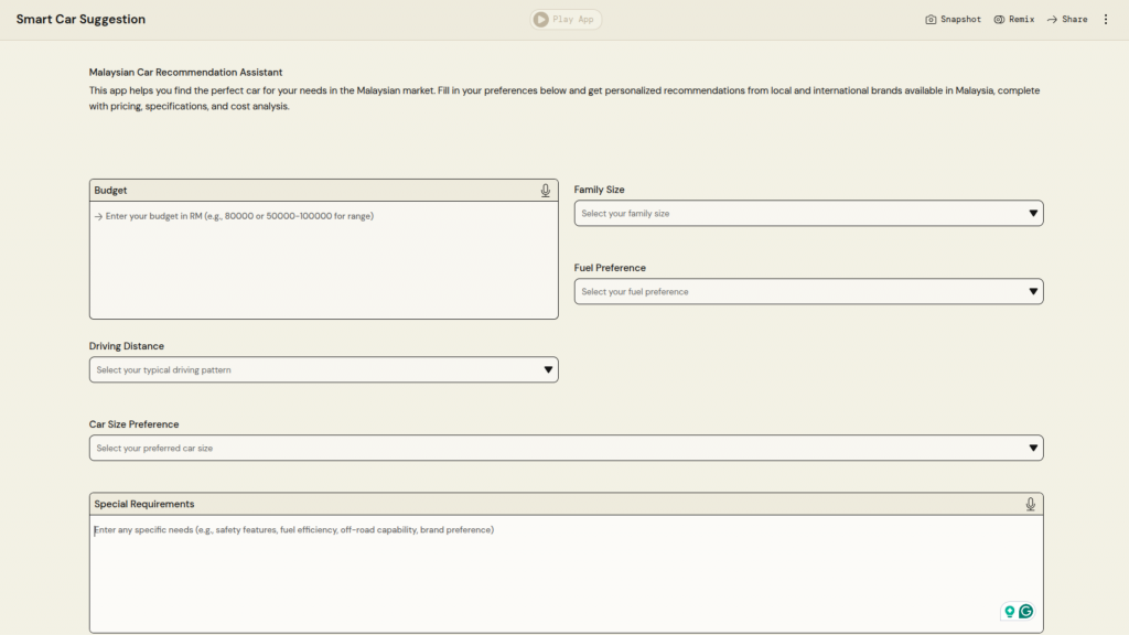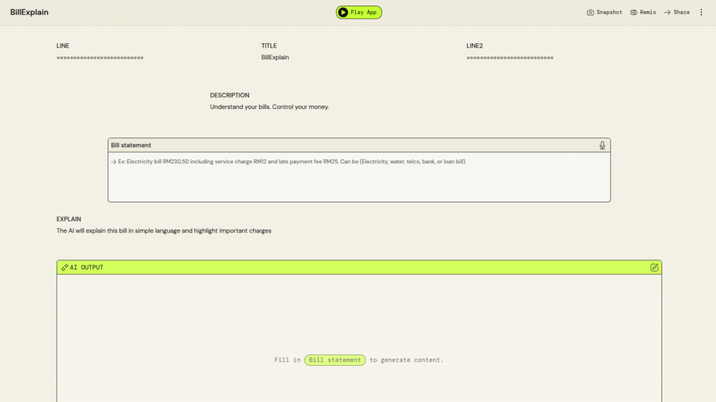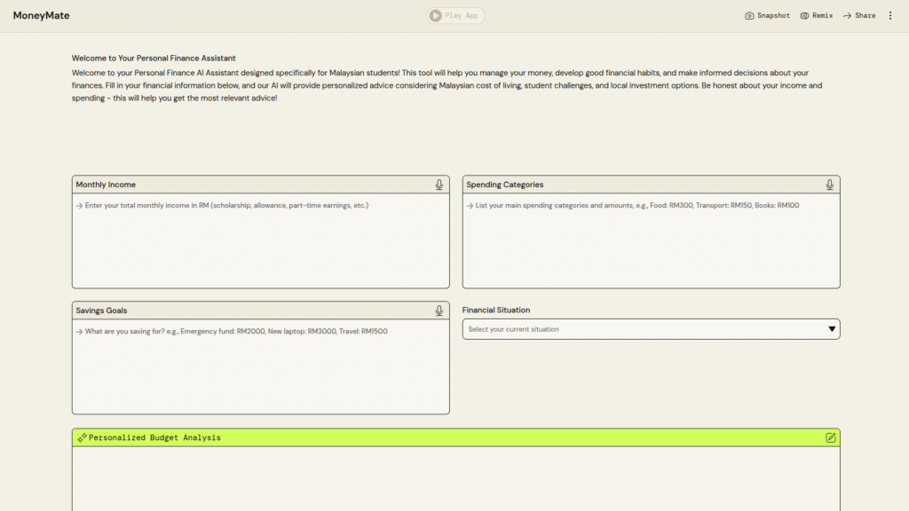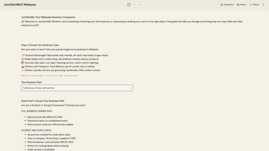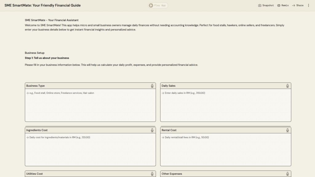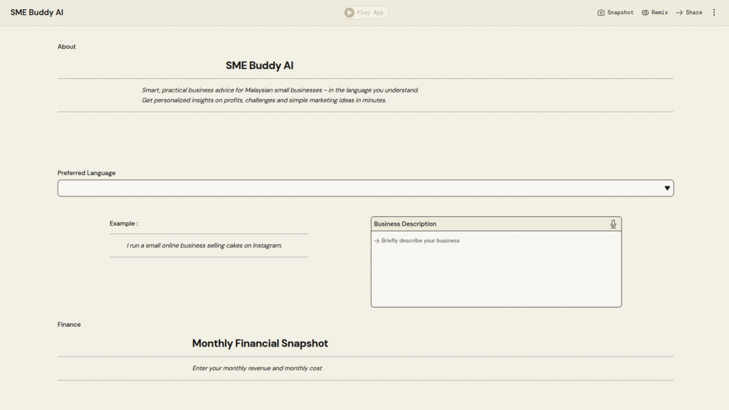 University Name: Universiti Teknologi MARA (UiTM) Student Name: Nur Mawardah Qistina Binti Samyu Category: Financial Inclusion & SME Empowerment Application Description: This AI-powered application generates creative business name ideas based on the user’s business description, preferred naming style, and number of suggestions using AWS PartyRock PartyRock Application Link: https://partyrock.aws/u/mawardah/yf5K8VrIg/NameGenius%253A-AI-Business-Name-Generator