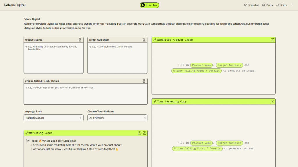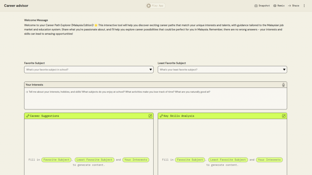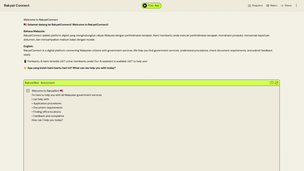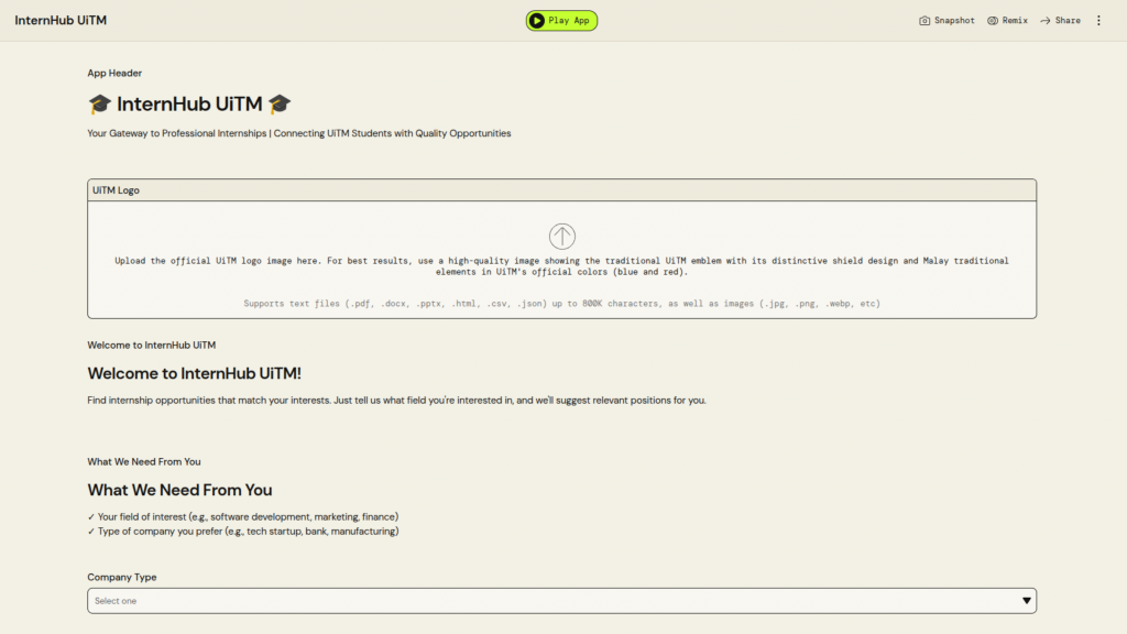 University Name: Universiti Teknologi MARA (UiTM) Student Name: Nur Syafiqah Syahirah Binti Zul Aszele Category: GovTech & Social Impact Application Description: Give suggestion for UiTM students in searching their internship company PartyRock Application Link: https://partyrock.aws/u/syafiqahsyahirah/m0bO8x0WA/InternHub-UiTM