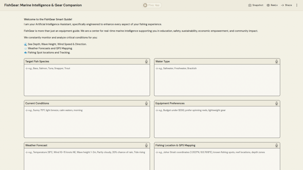 University Name: Universiti Tun Hussein Onn Malaysia (UTHM) Student Name: Muhammad Habibullah Bin Baharudin Category: Smart Education Application Description: FishGear is a comprehensive marine intelligence platform that provides real-time data, personalized equipment recommendations, and expert guidance on fishing techniques, safety, sustainability, and community impact to enhance anglers’ experiences PartyRock Application Link: https://partyrock.aws/u/Habib67/uFhJQ1Q7Q/FishGear%253A-Marine-Intelligence-and-Gear-Companion