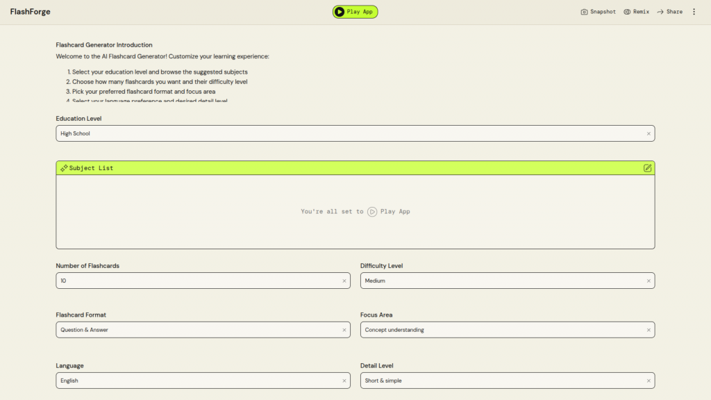 University Name: Universiti Malaysia Perlis (UniMAP) Student Name: Muhammad Arif Farhan Bin Muhammad Farid Category: Smart Education Application Description: Making a flashcards that every education level can be obtained PartyRock Application Link: https://partyrock.aws/u/arifar04/we1fq03Ja/FlashForge