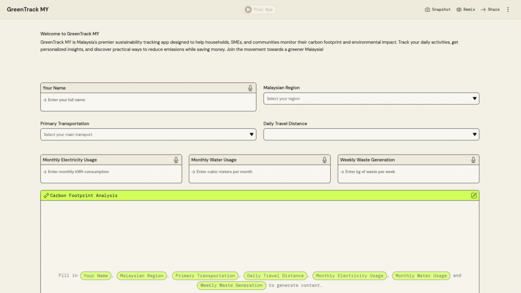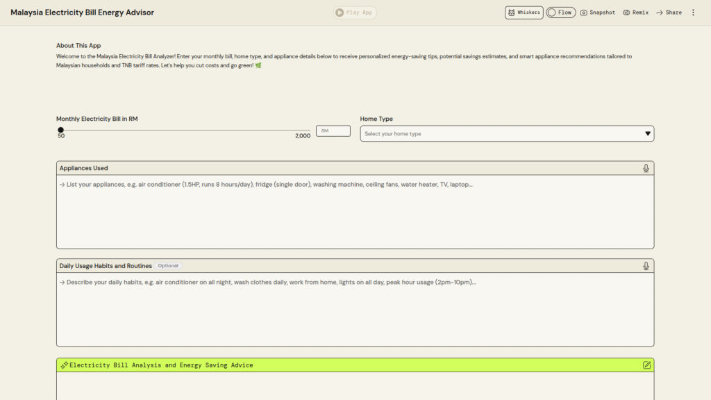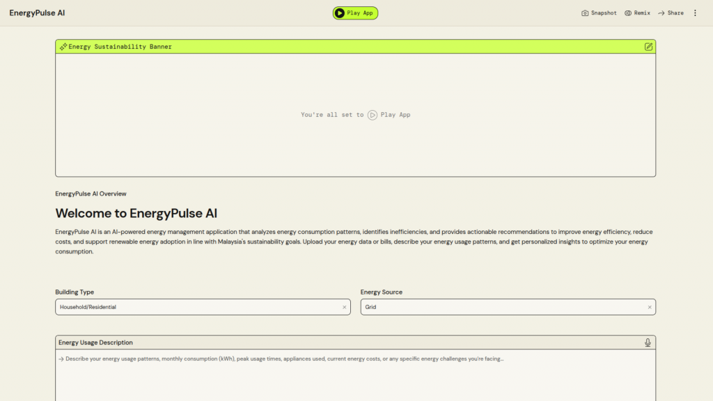 University Name: Universiti Tenaga Nasional (UNITEN) Student Name: Mohammad Irfan Ashman Bin Mohammad Zubairi Category: Sustainable Environment & Climate Application Description: A smart application that helps Malaysian households reduce electricity bills through personalized AI-powered insights. Users input their monthly bill, home type, and appliance usage, and the system analyzes their energy consumption to identify key […]